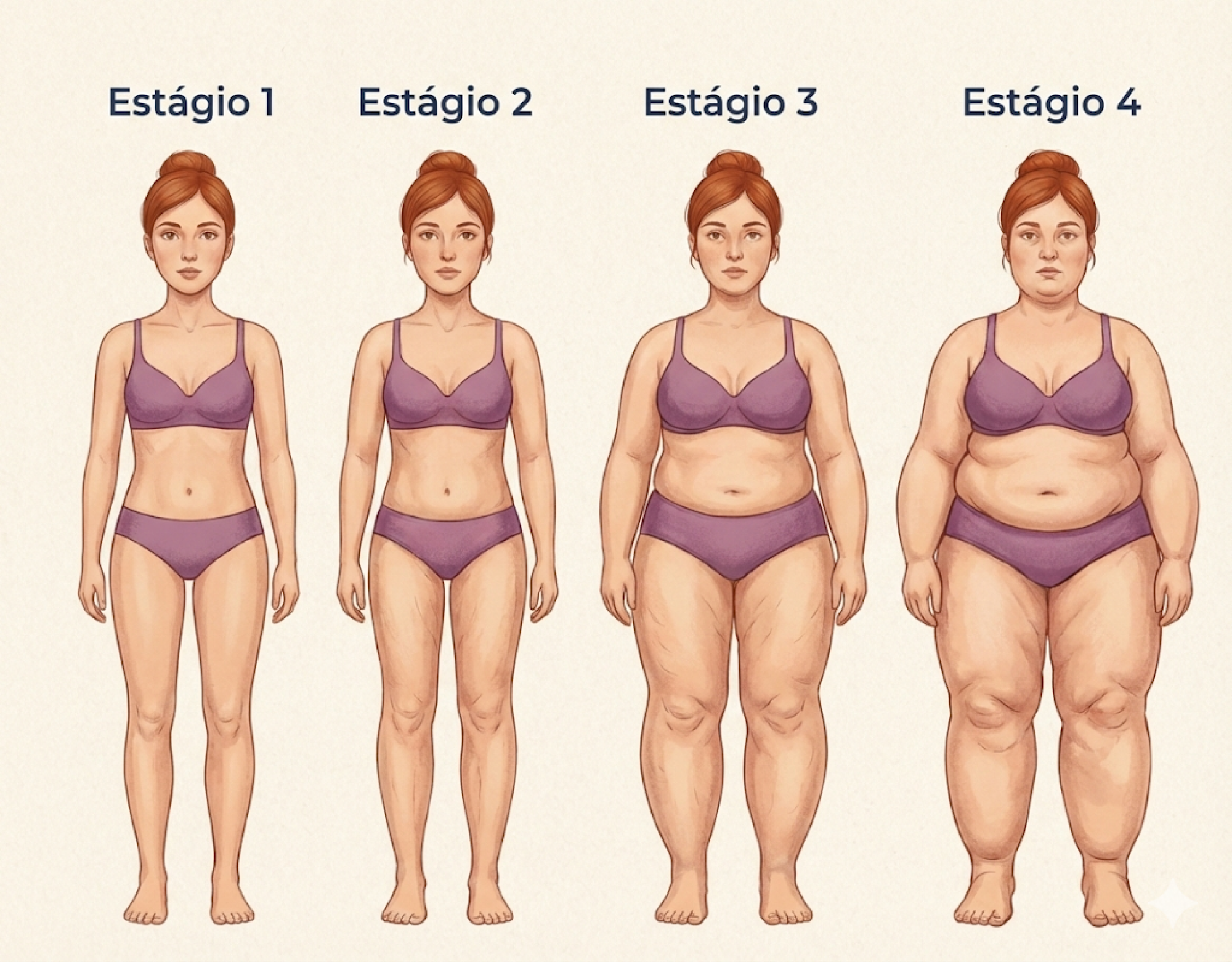 Reduzimos depósitos que criam desproporção entre tronco e membros inferiores, melhorando a silhueta sem procedimentos desnecessários.